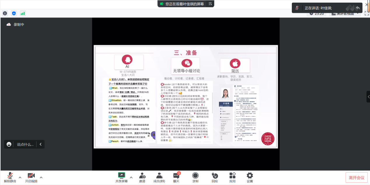 叶佳琪分享了自己的企业求职经历和经验。她表示在求职过程中,提前做好职业规划,积累实习经验并且时常复盘非常重要。此外,她还分享了公司面试程序和面试经验,例如性格测试、AI面试和无领导小组讨论等方面的技巧。